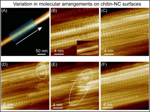 Atomic force microscopy gauges surface topography and chemical information by monitoring the strength of forces exerted on a nanoscale tip attached to a cantilever. The researchers used a modified AFM known as 3D-AFM, which enabled them not only to image the morphology of chitin nanocrystals but also to investigate the three-dimensional local organization of water molecules surrounding these nano structures. In their report, they noted a high degree of long-range order in the β chitin fibres, whose structure has so far been less thoroughly explored. They describe how the occasional breaks in that order “lead to a structure resembling partially bitten corncobs or a brickwork pattern”. Their AFM imaging also showed how the molecular arrangement runs right through the fibre. “These different structural components are not merely external aggregates;” they explain in the report. “Instead, they constitute an integral part of the chitin fiber(Fig. 2).”