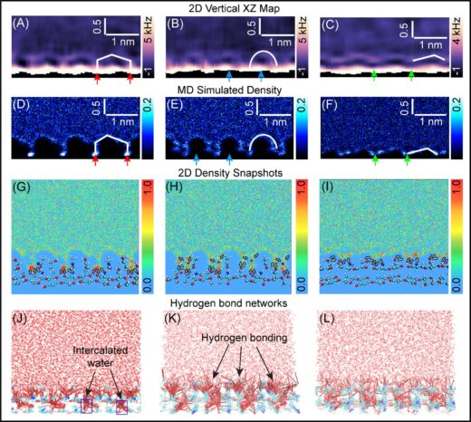 Figure 3: Comparison between water-oxygen density maps and experimentally obtained vertical ∆f maps. (A–C) Vertical 2D-xz ∆f maps taken along the chitin chain direction. (D–F) Simulated vertical 2D water-oxygen density maps along the chain direction at different lateral positions on the (1-20) crystalline plane of the β-chitin NC. The red, blue, and green arrows indicate the identical hydration features between the simulation and experiment. (G–I) Water-oxygen density snapshots (40) with overlaid chitin molecular structures. (J–L) Hydrogen-bonding networks formed between water molecules and the underlying chitin substrate.