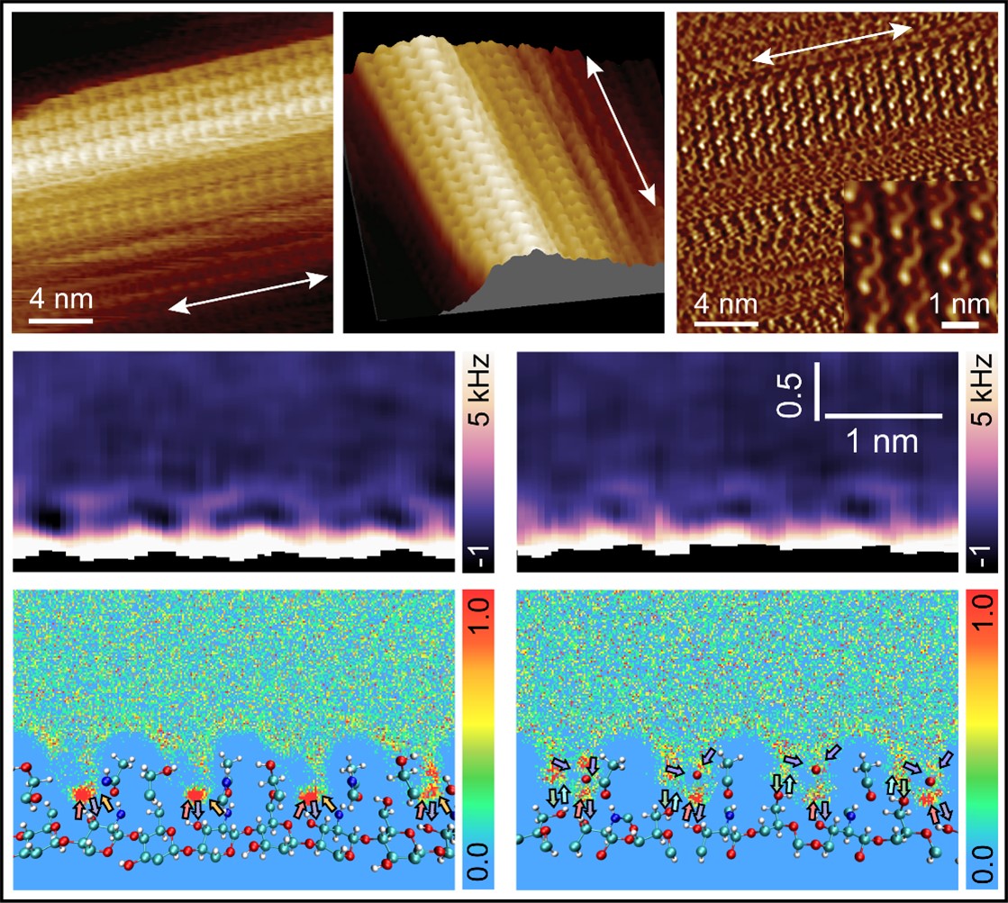 Chitin is a naturally occurring polymer with a number of attractive mechanical and chemical properties that many are seeking to mimic in bioengineered materials. Naturally occurring chitin has one of two crystal structures known as α – with the molecules aligned antiparallel – and β – with the molecules aligned in parallel. The nanoscale structure of chitin greatly affects the chemical and mechanical properties of the material, and here the structure that water forms around the fibres when they are hydrated can play a significant role. However, until now the details of these different structures were not well understood. Now researchers led by Ayhan Yurtsever and Takeshi Fukuma at Nano Life Science Institute (WPI-NanoLSI), Kanazawa University, together with collaborators Kazuho Daicho, Tsuguyuki Saito, and Noriyuki Isobe from the University of Tokyo, and molecular dynamics experts led by Fabio Priante and Adam S. Foster from Aalto University, Finland, have used 3D AFM and molecular dynamics to study the different structures and how water forms on them when they are hydrated for different pH levels (Fig. 1) The results of this study provide explanations for differences in how the two structures interact with enzymes and reactants.