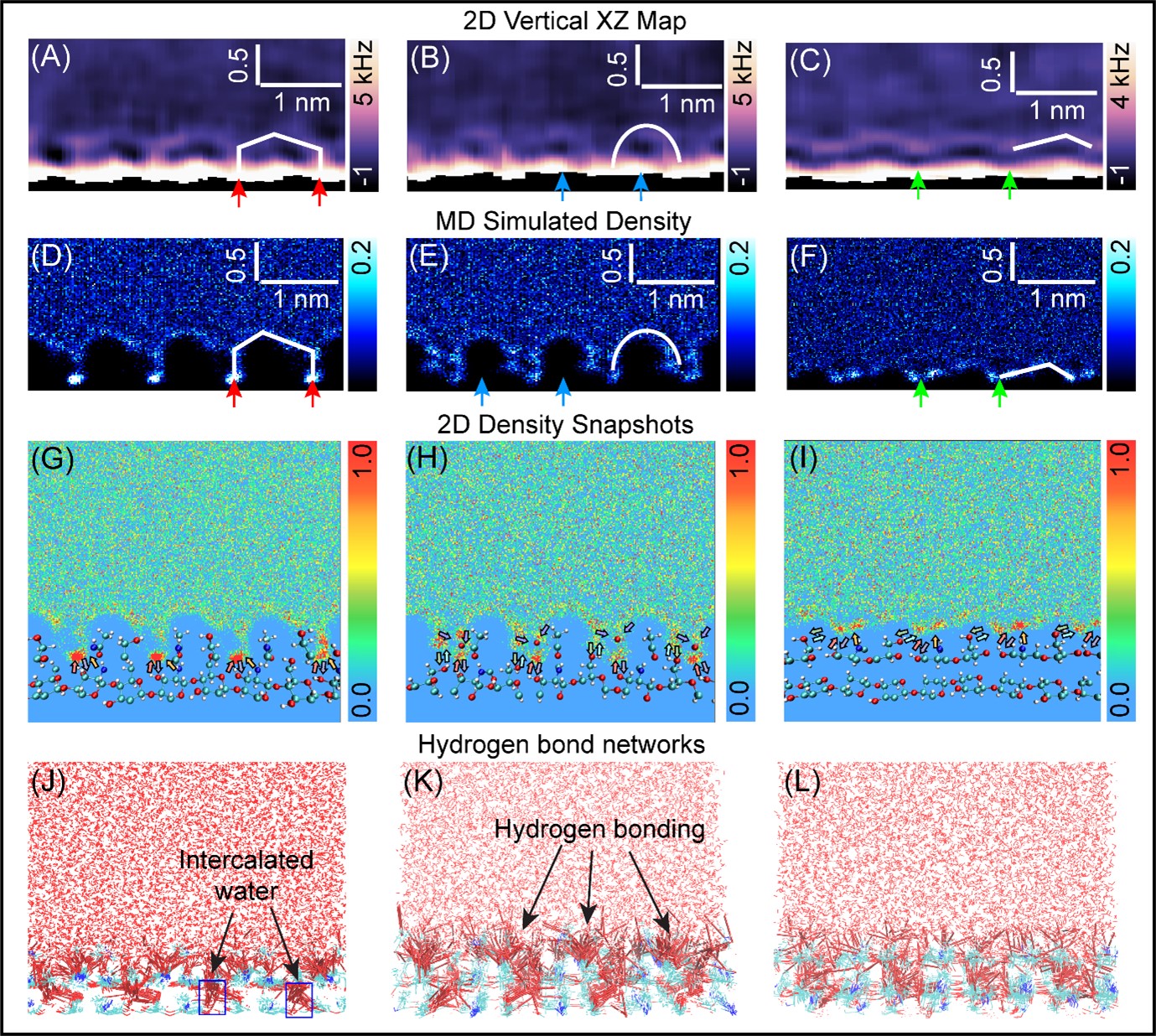 Figure 3: Comparison between water-oxygen density maps and experimentally obtained vertical ∆f maps. (A–C) Vertical 2D-xz ∆f maps taken along the chitin chain direction. (D–F) Simulated vertical 2D water-oxygen density maps along the chain direction at different lateral positions on the (1-20) crystalline plane of the β-chitin NC. The red, blue, and green arrows indicate the identical hydration features between the simulation and experiment. (G–I) Water-oxygen density snapshots (40) with overlaid chitin molecular structures. (J–L) Hydrogen-bonding networks formed between water molecules and the underlying chitin substrate.