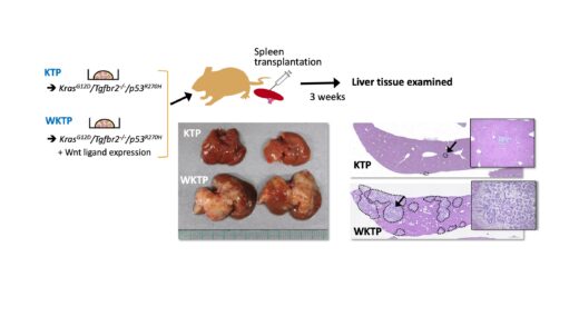 Two gastric organoid lines, KTP and WKTP were established from mouse stomach epithelium. KTP organoids carry driver mutations in Kras, Tgfbr2, and Trp53, whereas WKTP organoids additionally express Wnt ligand. After spleen transplantation, WKTP organoids–unlike KTP organoids–form multiple liver metastasis (Reproduced from: Yuichiro Furutani et al., Nature Communications (2026), under a CC BY-NC-ND 4.0 License).