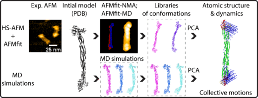 Figure A novel orkflow for analyzing the dynamics and atomic structures of alpha-actinin through the integration of HS-AFM with the AFMfit-NMA, AFMfit-MD, and MD simulations. The produced 3D conformations were processed by principal component analysis (PCA) to identify and classify dynamic atomic structures into distinct modes of collective motion (indicated by blue arrows). Copywrite: © 2026 Ngo et, published by American Chemical Society (CC-BY-NC-ND 4.0 ).
