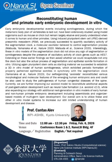 今回は、京都大学ヒト生物学高等研究拠点(WPI-ASHBi)よりCantas Alev教授をお招きし、『Reconstituting human and primate early embryonic development in vitro』と題してご講演いただきました。講演後の質疑応答では、参加者からたくさんの質問が寄せられ、有意義な意見交換の時間となりました。