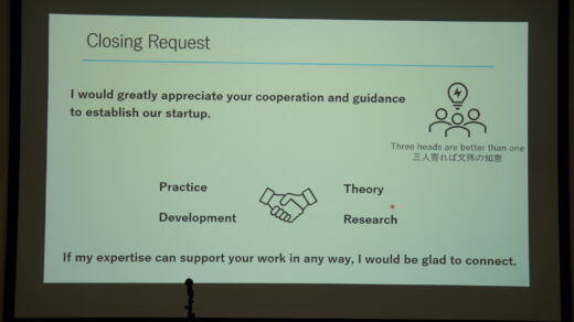会場では、2023年設立のベンチャーキャピタル会社Vision IncubateのCEO、松本邦夫先生も、的場先生のスタートアッププロジェクトに関心を示され、活発な質疑応答が行われました。