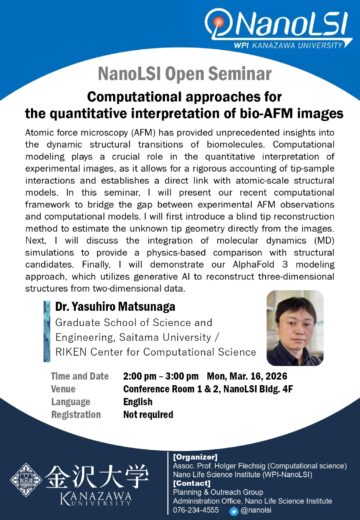 今回は、埼玉大学大学院理工学研究科 / 理化学研究所計算科学研究センターの松永 康佑 先生をお招きし、『Computational approaches for the quantitative interpretation of bio-AFM images』と題してご講演いただきました。講演後の質疑応答では、参加者からたくさんの質問が寄せられ、有意義な意見交換の時間となりました。