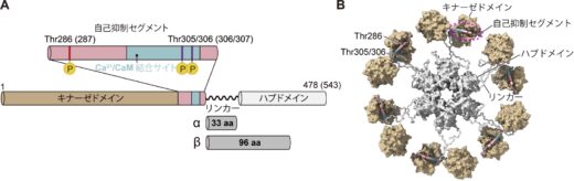 図 1:CaMKIIのドメイン構成。(A)括弧内の数字はβ型のアミノ酸残基を示す。α型とβ型の主な違いはリンカーのアミノ酸残基数である。電子顕微鏡画像に基づいて予想されたCaMKIIαの12量体構造モデル(B)。