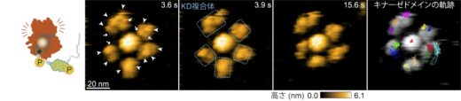 図 3:CaMKIIβホモ多量体のリン酸化活性化状態の連続する高速 AFM画像。キナーゼドメイン複合体(KD複合体、 青色破線)の形成が観察された。原著論文では動画を見ることができる。