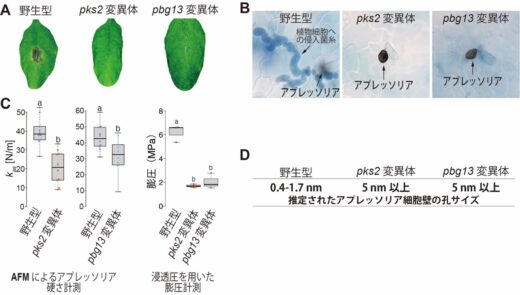 そこで、アプレッソリアにおける膨圧を異なる手法で検証しました。浸透圧の原理を利用した手法と、原子間力顕微鏡(AFM)[9]を用いた硬さの計測[9]のいずれにおいても、PKS2とPBG13の遺伝子を破壊した変異体(以降pks2およびpbg13変異体と表記)で膨圧が低下していることが示されました(図1C)。