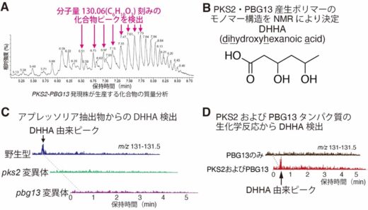 最後に、実際のアプレッソリアにおいてDHHAが生合成されているかを検証しました。その結果、高密度誘導が可能なアブラナ科炭疽病菌のアプレッソリアからDHHAが検出されました(図3C)。さらに、炭疽病菌のアプレッソリアから精製したPKS2とPBG13の生化学反応系からもDHHAが検出され、PKS2およびPBG13がDHHAの生合成に必要・十分であることが明らかとなりました(図3D)。